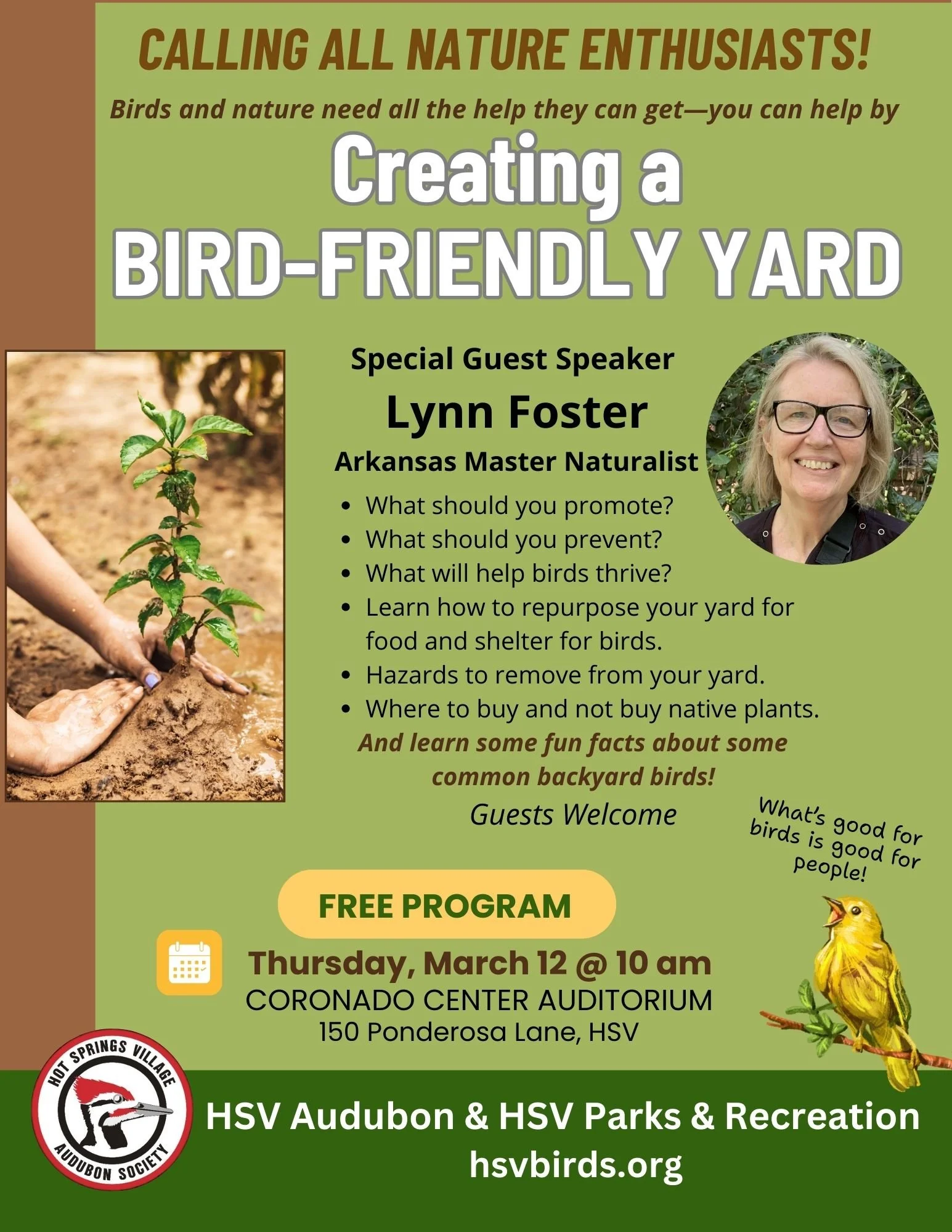 Join your HSV friends and neighbors to learn all about creating a bird-friendly yard from our special guest speaker, Lynn Foster, Arkansas Master Naturalist